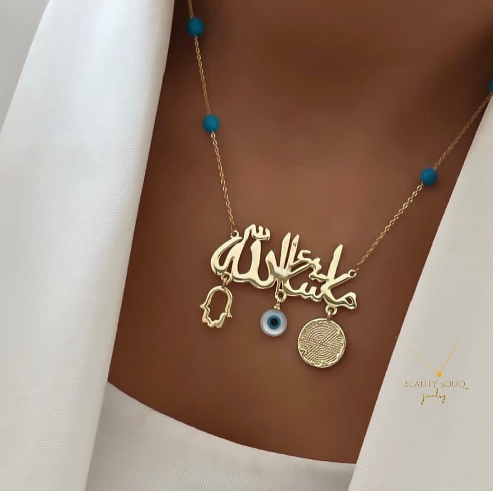 قلادة عصرية مزينة باسم الله وبالأحجار الملونة هذه القلادة قطعة مميزة وجميلة تعكس الأناقة والروحانية. صممت